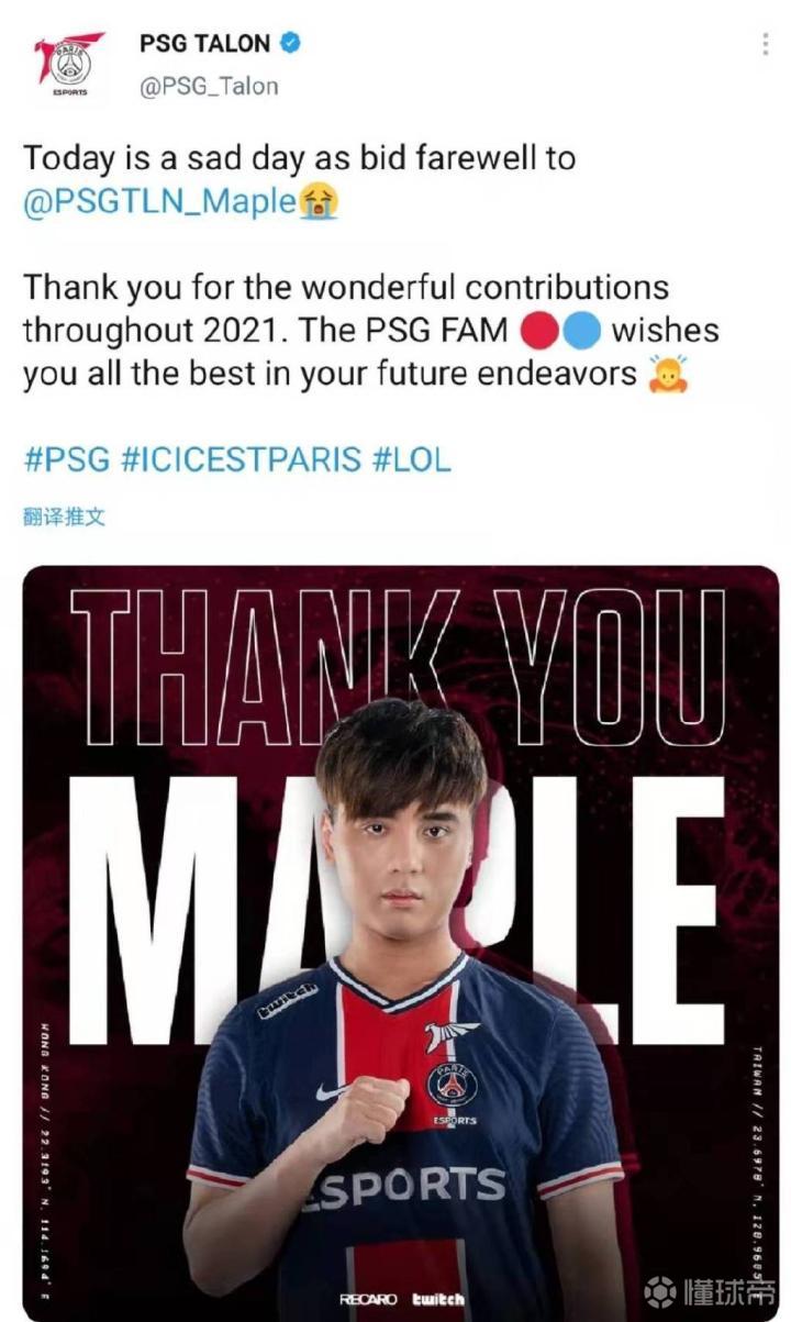 英雄联盟PSG战队:中单选手Maple离队 峡谷全视野 峡谷全视野2021-12-06 22:22今天英雄联盟PSG战队更新社交媒体,宣布中单Maple离队。今天是悲伤的一天,我们将告别Maple。谢谢2021年你的辛苦付出,愿你前程似锦!Maple选手曾于2018年~2020年加入LPL赛区的SN、LNG战队。展开更多