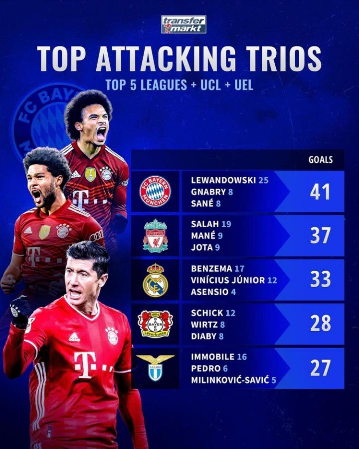 德国足球转会市场盘点本赛季进攻火力最强的“三叉戟组合”: 1、莱万、萨内、格纳布里(共打入41球,其中莱万25球,格纳布里和萨内各8球); 2、萨拉赫、马内、若塔(共打入37球,其中萨拉赫19球,马内和若塔各9球); 3、本泽马、维尼休斯、阿森西奥(共打入33球,其中本泽马17球,维尼休斯12球,阿森西奥4球); 4、希克、维尔茨、迪亚比(勒沃库森,共打入28球,其中希克12球,维尔茨和迪亚比各8球); 5、因莫比莱、佩德罗、米林科维奇(拉齐奥,共打入27球,其中因莫比莱16球,佩德罗6球,米林科维奇5球)。 注:进球数包括五大联赛+欧冠/欧联杯进球数 限时特惠福利!!! 同时购买《王者梅西》典藏版(原价90元)+《欧冠之王-C罗》典藏版(原价96元),限时特惠仅需98元!!!随书赠送《梅罗对弈》《欧冠之王》两本珍藏纪念册以及海报2张、球星卡6张!!!
