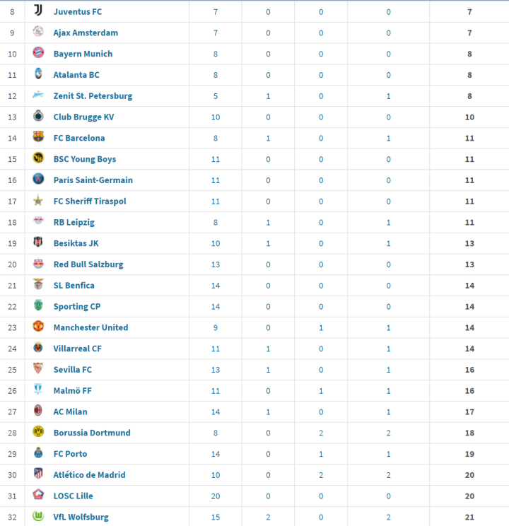 已晋级但未确定名次:(D)皇家马德里+国际米兰、(H)切尔西+尤文图斯