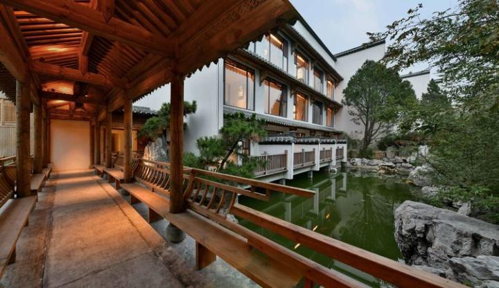 推门入内,大堂呈现一派江南风情与后现代主义融合的风格。