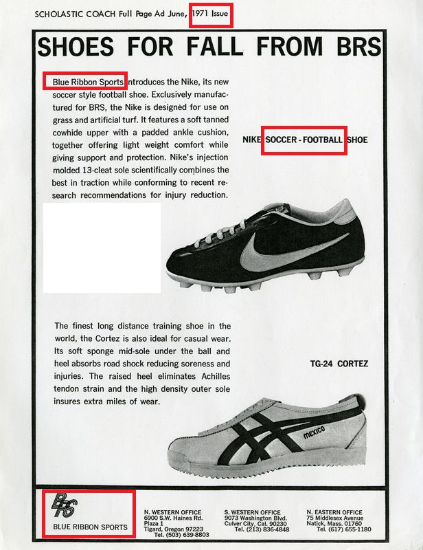1972年蓝带体育正式更名为nike,成为了一家运动鞋生产销售的公司,由于经营asics运动鞋多年,nike成立之初的产品,大部分也都是抄袭了asics的产品,日本运动鞋在舒适性方面的优势,帮助nike在美国市场取得了一席之地。他们也很明确地放弃了在美国不大的足球市场,而是进军在美国更有市场的美式足球领域和其他领域。