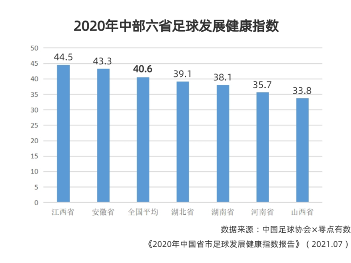 今年7月,中国足球协会联合北京零点有数数据科技股份有限公司发布《2020年中国省市足球发展健康指数报告》,安徽获得43.3分,排名全国第九,中部地区第二,高于全国平均的40.6分。
