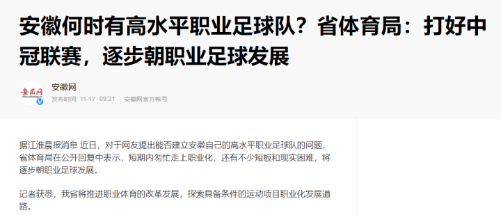 11月17日,援引安徽本地纸媒《江淮晨报》的一则消息把销声匿迹数年的安徽足球再一次推到聚光灯下。安徽省体育局在公开回复中明确表示:打好中冠联赛,逐步朝职业足球发展。