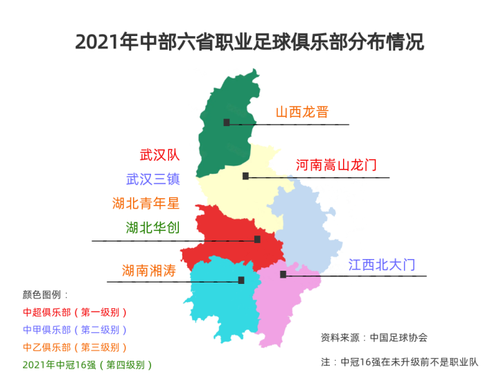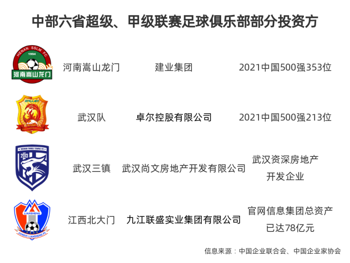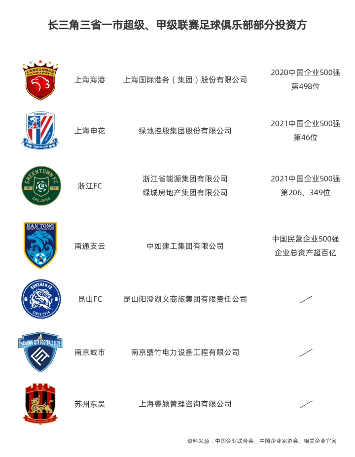 2021年,中部六省共有4家俱乐部参与全国第一、第二级别足球职业联赛,俱乐部幕后的投资方半数是近两年中国企业500强,其余两家也是当地资深企业,财力雄厚;长三角三省一市共有7家俱乐部参与全国第一、第二级别足球职业联赛,拥有近两年中国企业500强企业投资方的俱乐部比例也接近43%。