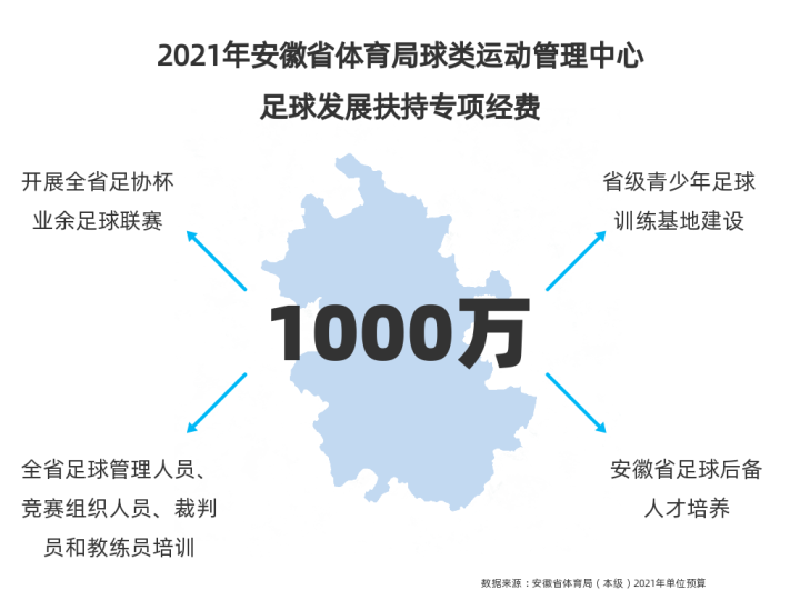 在没有企业愿意出资帮助的情况下,安徽省体育局通过自身力量建设属于本省的职业足球俱乐部有现实困难。根据《安徽省体育局(本级)2021年单位预算》提供的数据,2021年安徽省体育局球类运动管理中心足球发展扶持专项经费为人民币1000万元。这1000万元的专项经费将被用于开展全省足协杯业余足球联赛;进行省级青少年足球训练基地建设;组织全省足球管理人员、竞赛组织人员、裁判员和教练员培训;安徽省后备人才培养四方面。这也就意味着安徽省体育局没有足够的资金单独进行职业足球俱乐部建设。