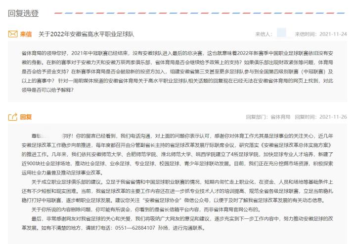 安徽省体育局有关人员在11月26日给予笔者的公开回复中表示:近几年,安徽足球改革工作稳步向前推进。