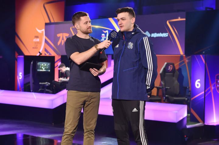 (图)欧文在意大利的2020年国际足联电子世界俱乐部杯中采访哈斯塔格联队的选手哈里-约翰·海斯凯茨