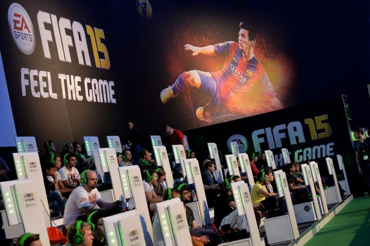 (图)2014年8月,在一个德国的游戏展销会上试玩FIFA 15