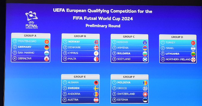 2024五人制足球世界杯欧洲区资格赛预赛阶段分组抽签出炉: A组:黑山、德国(该组东道主)、圣马力诺、直布罗陀 B组:挪威(该组东道主)、丹麦、塞浦路斯、马耳他 C组:科索沃、亚美尼亚、保加利亚(该组东道主)、苏格兰 D组:土耳其、以色列、立陶宛(该组东道主)、北爱尔兰 E组:阿尔巴尼亚、瑞典(该组东道主)、安道尔、奥地利 F组:摩尔多瓦(该组东道主)、希腊、瑞士、爱沙尼亚 比赛将于明年4月4-13日进行,每组前两名共12支代表队出线,与直通的24支球队(西班牙、俄罗斯、葡萄牙、哈萨克斯坦、克罗地亚、塞尔维亚、阿塞拜疆、意大利、捷克、乌克兰、斯洛文尼亚、波黑、波兰、芬兰、罗马尼亚、斯洛伐克、格鲁吉亚、白俄罗斯、荷兰、匈牙利、法国、比利时、拉脱维亚、北马其顿)一起进入主赛阶段小组赛。 (信息来源:欧足联官网 https://www.uefa.com/futsalworldcup/news/026f-13c034fd76f5-73a87b088508-1000--preliminary-round-draw/)