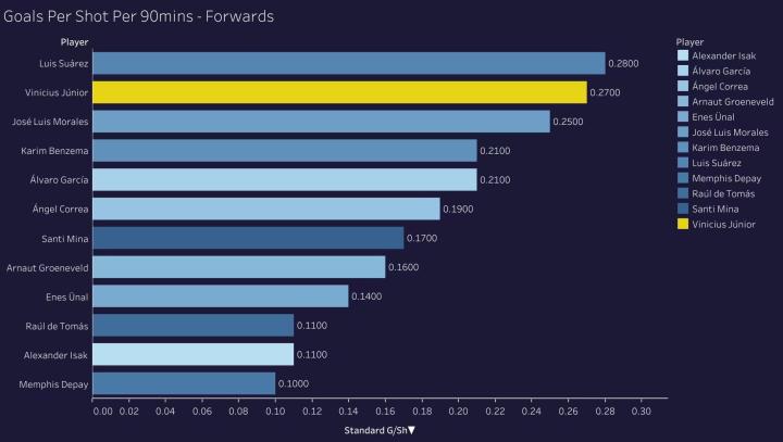 不仅如此,维尼修斯的平均进球数据也确实好于此前几个赛季,他每90分钟进球数为0.27,这项数据仅次于苏亚雷斯这样的高产射手,远超上赛季的0.07和2019-20赛季的0.08。
