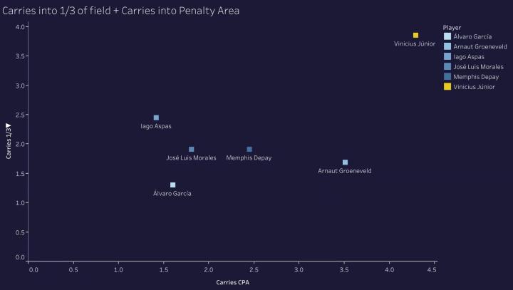 维尼修斯能够连续带球进入对方进攻三区,而他带球进入对方18码禁区的数据是西甲最优,这显然是维尼修斯的“独门绝技”。
