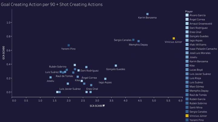 维尼修斯每90分钟的创造射门数仅次于本赛季表现非凡的本泽马,与本泽马的4.77次相比,维尼修斯平均每90分有5.69次射门动作,与上赛季相比,这是一个难以置信的进步。