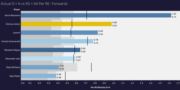 维尼修斯的平均 XG + XA 为 0.55,而他实际的进球(G) + 助攻(A)为 0.98,这一数据也仅次于本泽马高光的那个赛季(他的 G+A 是他的 XG+XA 的两倍多),种种数据都足矣证明维尼修斯本赛季取得了质的飞跃。