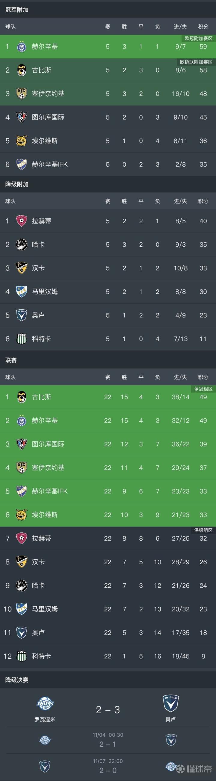2021赛季芬兰足球超级联赛落幕,赫尔辛基在最后一轮客场1-1战平古比斯,从而以1分优势力压对手,获得队史第31个联赛冠军。 本赛季古比斯给芬兰霸主赫尔辛基制造了巨大麻烦,芬兰杯决赛古比斯击败赫尔辛基,时隔32年再次夺冠,同时联赛也险些夺冠。 在联赛还剩3轮的时候,榜首的古比斯还领先赫尔辛基3分,但之后古比斯2连平,被2连胜的赫尔辛基反超了1分。最后一轮古比斯主场战胜赫尔辛基仍然可以夺冠,但是未能把握机会,遗憾地错失2021赛季双冠王。 联赛冠军赫尔辛基获得欧冠附加赛资格,2-4名古比斯、塞伊奈约基、图尔库国际将参加欧会杯附加赛。 本赛季芬超只有赫尔辛基杀进欧战正赛,但是欧会杯小组垫底已遭淘汰。 附:近5年芬超冠亚军 2017: 赫尔辛基 古比斯 2018: 赫尔辛基 罗瓦涅米 2019: 古比斯 图尔库国际 2020: 赫尔辛基 图尔库国际 2021: 赫尔辛基 古比斯