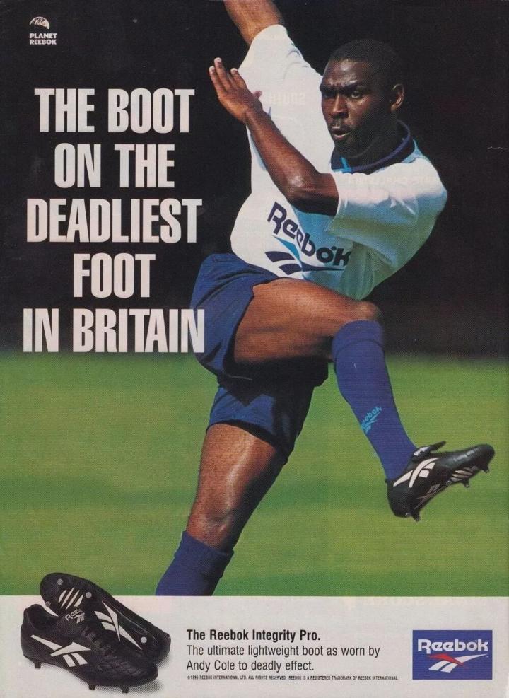 1997年,sidewinder出了第二代,这款鞋应该不是tresser的作品,因为当时他正在nike服役,设计了air max97和nike gx,水星等产品。曼联的黑风双煞之一安迪科尔就曾经使用这款球鞋,安迪科尔在纽卡斯尔成名后,马上被锐步签约,之后他在93-94赛季打入34球,受到曼联垂青。他也成为了锐步当时的主要代言人之一,不过在1999年欧冠决赛前,nike突然下手签约了安迪科尔,让他穿上了水星球鞋。