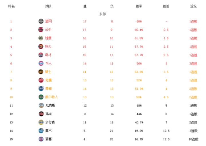 接下来我们一起来看看NBA东部和西部的最新排名: