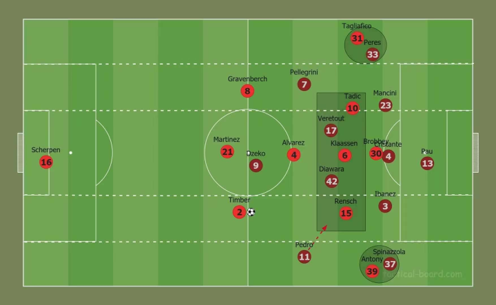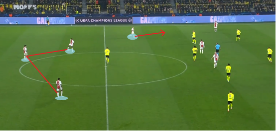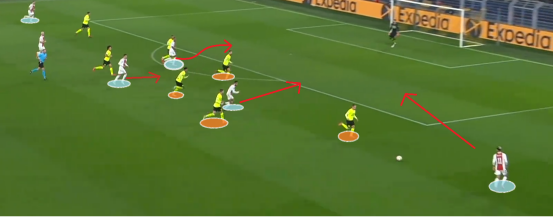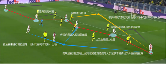 此时的前场便形成套边的边后卫与右侧安东尼作为边路两人与中路四人的进攻态势。这样一来阿贾克斯在进攻端便可以通过丰富的人数优势来形成配合取得进球。这也是阿贾克斯本赛季最熟悉的战术了。