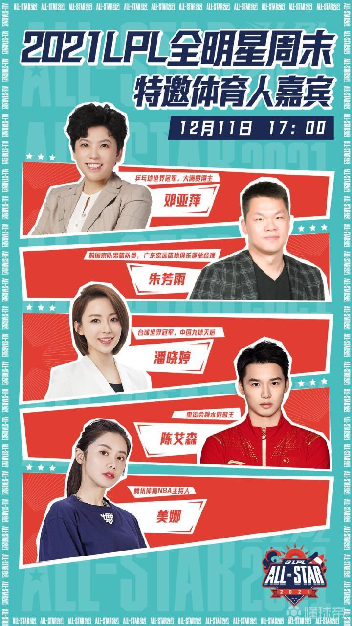 峡谷全视野LPL官博:2021英雄联盟LPL全明星周末即将拉开帷幕,荣耀日12月11日正式开启年度颁奖盛典。我们有幸邀请到乒乓球世界冠军、大满贯得主邓亚萍,前国家男篮队员、广东宏远篮球俱乐部总经理朱芳雨,台球世界冠军、中国九球天后潘晓婷,奥运会跳水双冠王陈艾森,亲临现场为获奖人颁奖,一起见证荣耀时刻。还有腾讯体育NBA主持人美娜跨界现身客串主持全明星周末,一起期待吧。