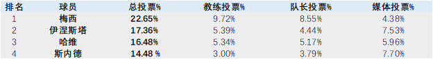 根据FIFI公布的信息,在媒体选票中斯内德得到7.70%的选票位列第一,伊涅斯塔以7.53%位列第二,与斯内德的差距极小。哈维位列第三,梅西只得第四名。
