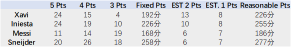 但法国足球的实际的投票规则是5个名额,( 5分、4分、3分、2分、1分),而不是合并后的3个名额。按照以前的规则,合并后的5分、3分、1分票可以对应原规则下的5分、4分、3分票,而 2分票和1分票则需要进行一定的估计。经过统计和合理推断,斯内德预计会以277分位列第一,伊涅斯塔以微弱的差距排在第2,梅西依旧排在第4。
