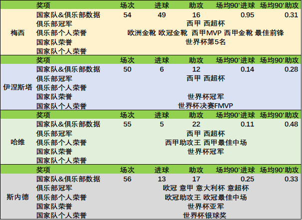 注5:本文所有球员的荣誉资料来自于Wikipedia,所有球员的数据资料来自于Transfer Market。Transfer Market是将造乌龙,打门被扑队友补射等算入助攻数据的,所以助攻数据可能和某些机构略有不同。