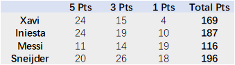2010年是中场球员的天下,斯内德是前腰,哈维伊涅斯塔是组织型中场,哈维在国家队踢前腰,梅西在巴萨踢边锋,回到阿根廷也是踢前腰的。很有趣的是2010年IFFHS最佳组织中场的前四位也正是这四名球员:哈维 223分,伊涅斯塔 148分,斯内德 128分,梅西 111分。