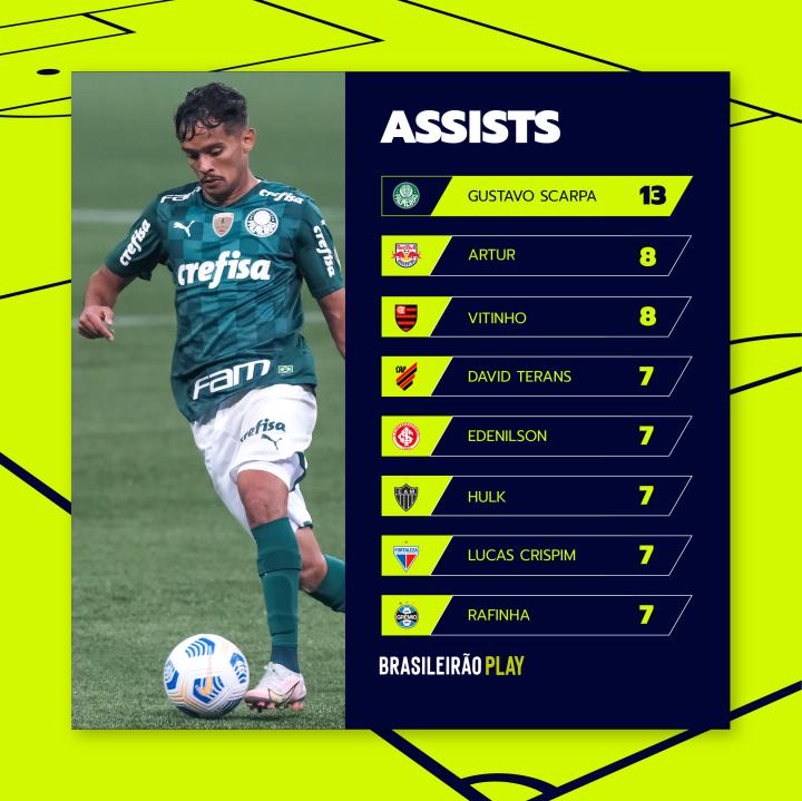 斯卡尔帕(13记助攻,中场,帕尔梅拉斯)