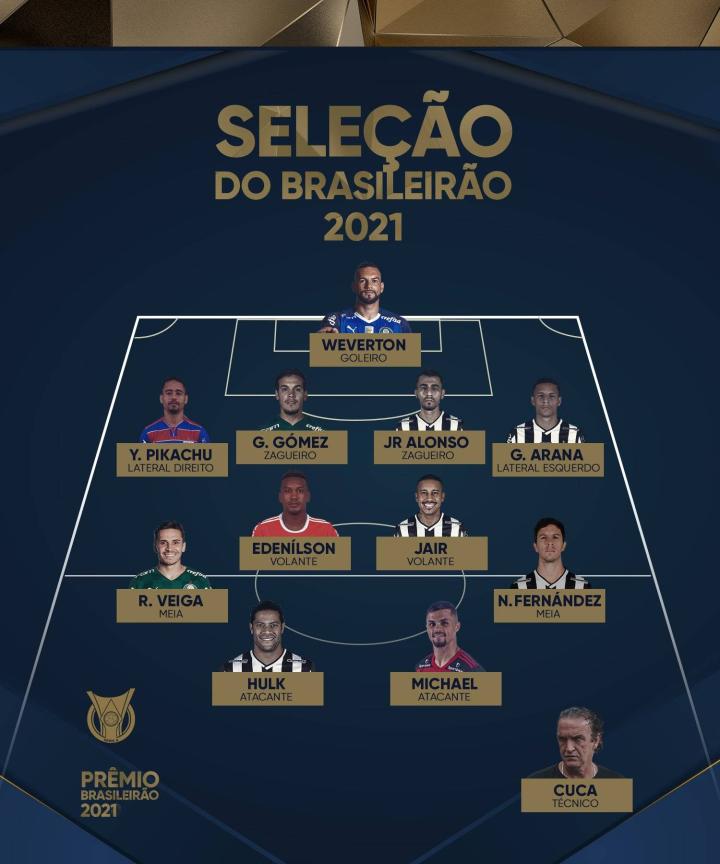 中场:维加(帕尔梅拉斯)、埃德尼尔森(巴西国际)、雅伊尔(米内罗竞技)、费尔南德斯(米内罗竞技)