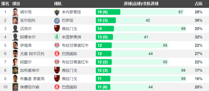 前锋:胡尔克(米内罗竞技)、迈克尔(弗拉门戈)