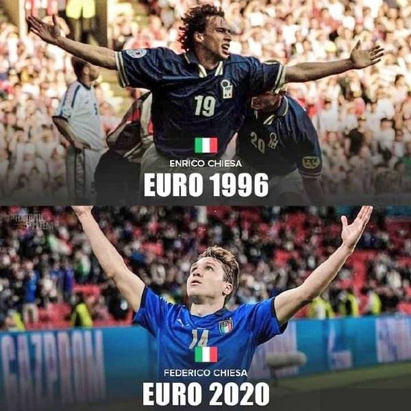 父子俩跨越时空的联动令人感叹,而接下来的剧情则更加激荡——靠小基耶萨右脚弧线球的灵光乍现逼平西班牙,赢得点球决胜机会;开场早早落后,还是小基耶萨拼尽全力冲击英格兰防线,用“怀抱炸药包”的冲击方式、冒着受伤的锋线为意大利赢得生机……
