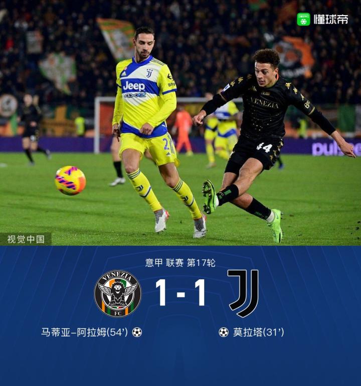 第55分钟,哈普斯左路传中,马蒂亚-阿拉姆弧线球破门,威尼斯1-1尤文图斯!