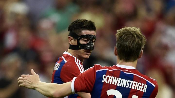 那真是太可惜了。在这次受伤之前,我经常能进球,在受伤后的比赛里,我进球变少了。具有讽刺意味的是,那正值德国杯半决赛对阵多特蒙德,和在欧冠半决赛对阵巴塞罗那。如果我处于100%的状态,谁知道比赛会如何发展呢。戴着面具踢球非常困难。我全力以赴,但状态要比正常情况下少了40%。我注意到,尤其是在禁区内,做出快速反应对我来说更加困难,因为我的视野有限。那是一段艰难的时期。但我知道球队需要我,我要全力以赴。