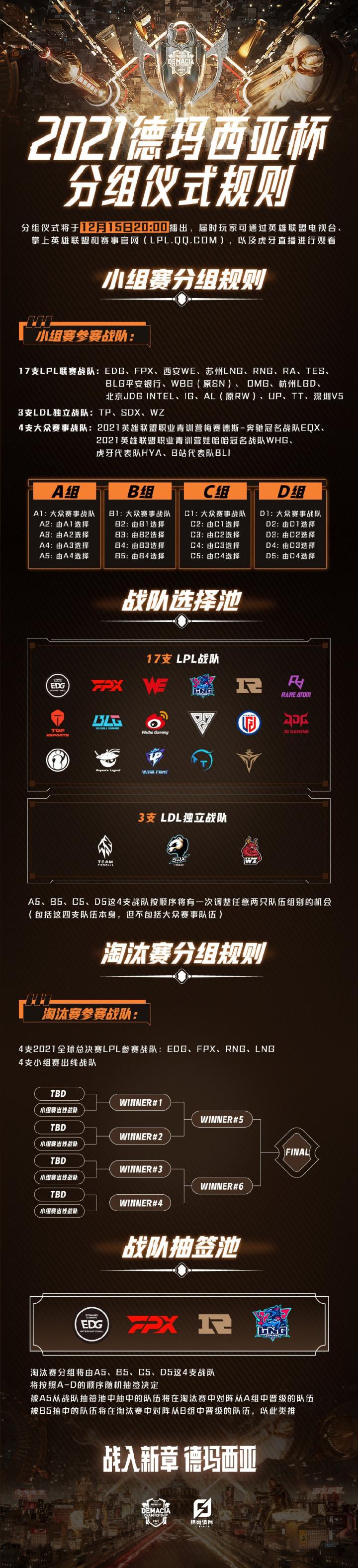 4支2021全球总决赛LPL参赛战队:EDG、FPX、RNG、LNG,将直接晋级到淘汰赛阶段,淘汰赛分组将由小组赛中最后四个被选中的队伍,即A5/B5/C5/D5,按照A-D的顺序随机抽签决定,被A5抽中的队伍将在淘汰赛中对阵从A组中晋级的队伍,被B5抽中的队伍将在淘汰赛中对阵从B组中晋级的队伍,以此类推。