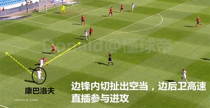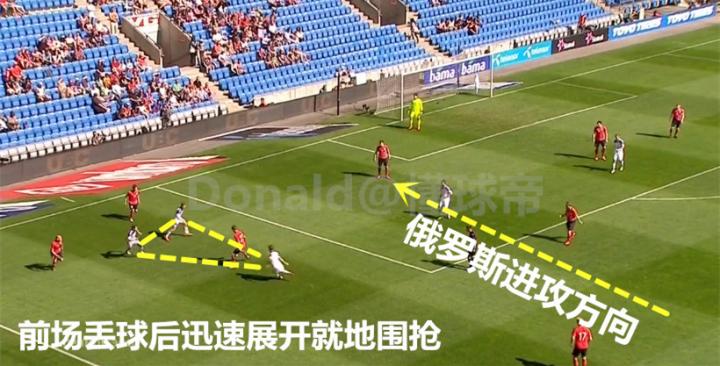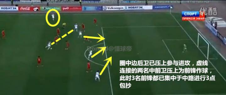 在进攻端俄罗斯十分敢于投入兵力,除了两名中卫和后腰,其余球员只要有机会都会积极参与进攻。正因为这样,一旦他们在前场丢球也能有足够的队员迅速展开围抢。当边后卫压上时边锋会和顶在最前面的中锋一起进入禁区抢点,即便未能抢到第一点也能造成对方后防线混乱,创造更多的补射机会。