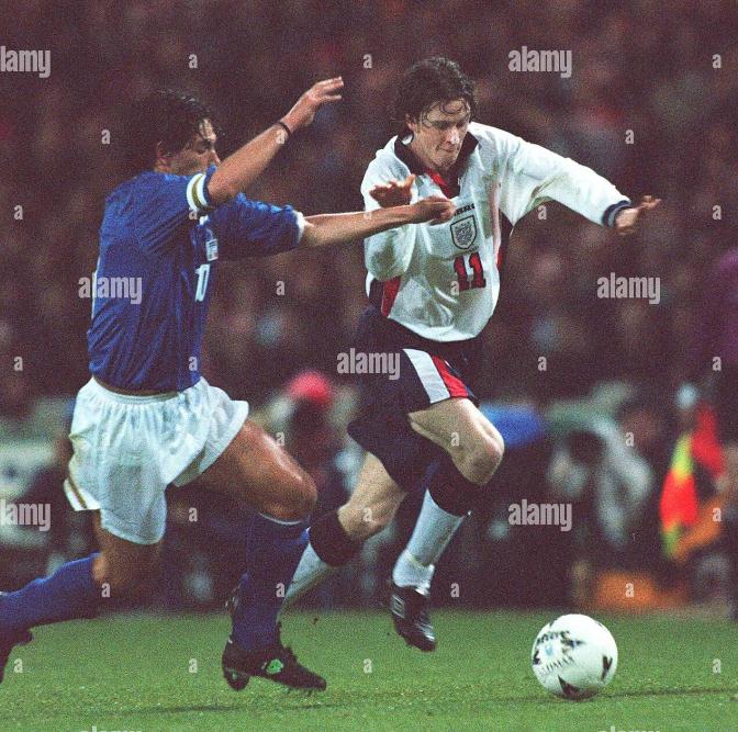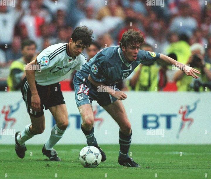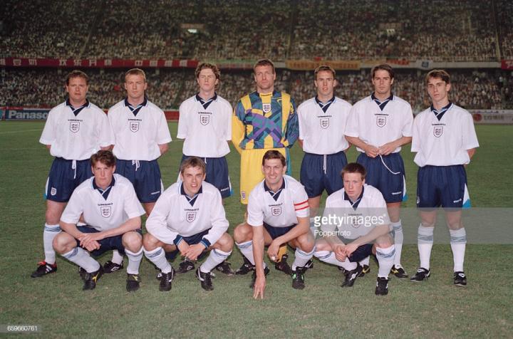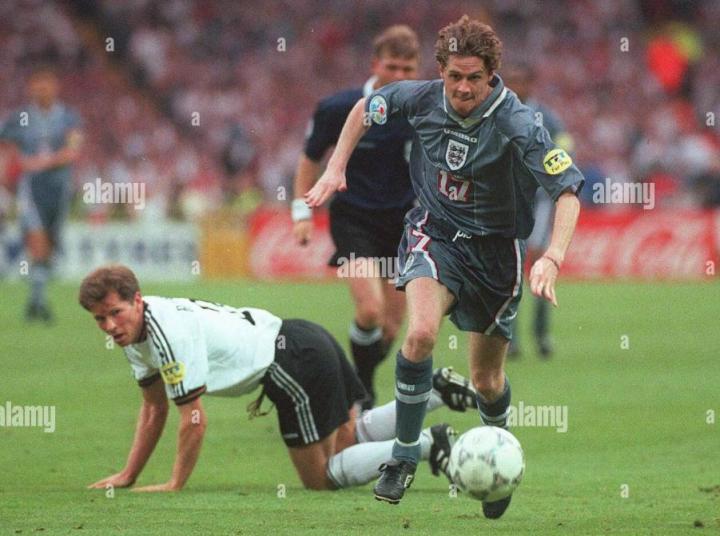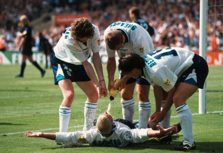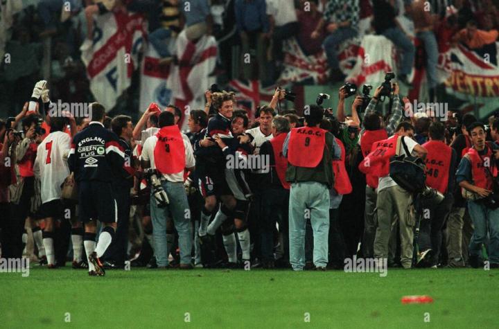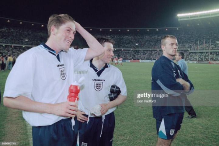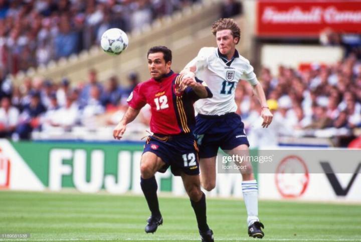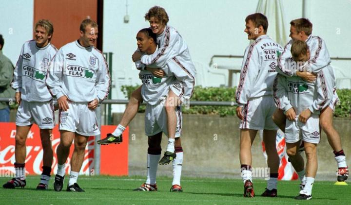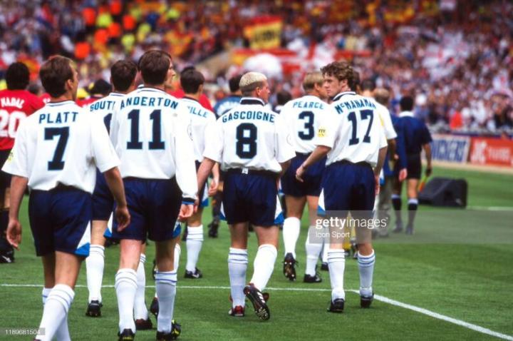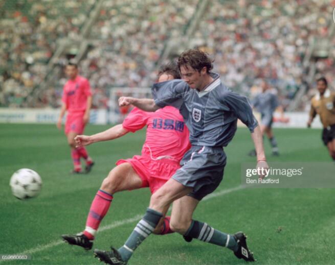 回到英格兰,欧锦赛开打,麦克马纳曼是英格兰队主力,他在英格兰队右路表现出色,但是首场揭幕战东道主英格兰并没有能战胜瑞士,双方1比1握手言和。第二场英格兰遭遇苏格兰,那场比赛最终英格兰2比0获胜,加斯科因在那场比赛打入惊世骇俗的一球,进球后,那个庆祝动作也是令人难忘。这个动作是英格兰队的酒鬼们灌酒的动作,叫”牙医椅“。麦克马纳曼也参与其中,一看就是轻车熟路。