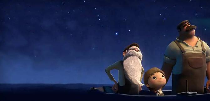 深蓝夜空之下,宁静深邃的大海中央,摇来一艘名叫“月神(La Luna)”的小船。船上坐着祖孙三代,拖着长长白胡子的爷爷,孔武健壮的父亲,以及忽闪着清澈明亮大眼睛的小男孩。爷爷送给孙子一顶帽子,似乎象征了某种重要仪式的开始,对于男孩来说,也许这便是他成为男人的证明。只是自古以来,一代与一代相互依存,却总有思想上的鸿沟,割舍不掉的则是血缘之情。不知不觉间,散发着乳白色皎洁光芒的满月从海水中升起,悬浮夜空。爸爸支好梯子,男孩则背着铁锚爬了上去。原来,那发出光芒的竟然是遍布月亮表面的星星,它们穿过宇宙,似流星般坠落,装饰着这颗美丽的小行星。