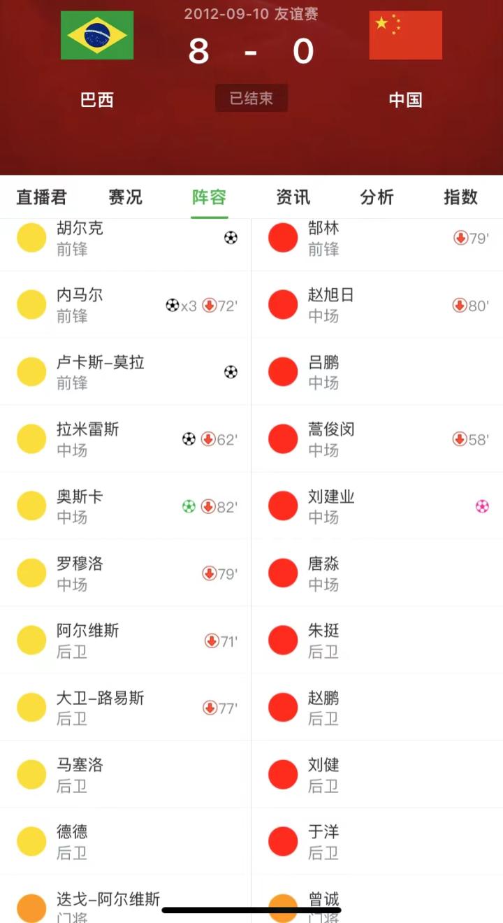 12年的中国有两场比赛比较经典,一场是欧洲杯前0:1小负西班牙队,大卫席尔瓦打入唯一进球;一场是9月友谊赛0:8惨败巴西队,那场比赛至今都是国足历史最大比分输球纪录,内马尔此役完成了帽子戏法,从那一刻起这支年轻的巴西队逐渐被中国球迷所熟知,而那场比赛进球的胡尔克、奥斯卡和拉米雷斯都在日后来到了中超踢球,另外两粒进球,分别是小卢卡斯的破门和刘建业的乌龙球。10年时间,从0:4,到0:8,从互有攻守甚至有一脚门柱,再到全场除了角球没有一次像样的进攻。中国只守住了前20分钟,奥斯卡、内马尔、胡尔克、卢卡斯,这个进攻火力太恐怖了,我们清晰的认识到了世界强队认真踢的时候我们到底有多大的差距。