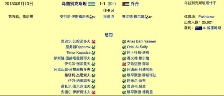 次回合120分钟精华双方不得不进行残酷的点球大战,而点球大战居然进行了10轮,艾哈迈多夫和伊斯梅洛夫罚丢,祖胡罗夫扑出了一粒点球,乌兹别克又一次倒在了10强赛的附加赛。