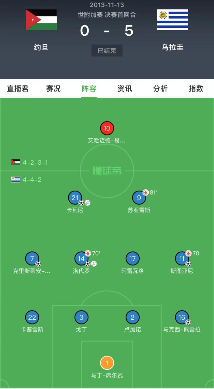 约旦那边,虽然进入了洲际附加赛,但是面对美洲冠军乌拉圭队,约旦首回合便在主场0:5脆败。佩雷拉、斯图亚尼、克里斯蒂安·罗德里格斯、卡瓦尼先后破门。次回合两队互交白卷,乌拉圭顺利晋级世界杯。
