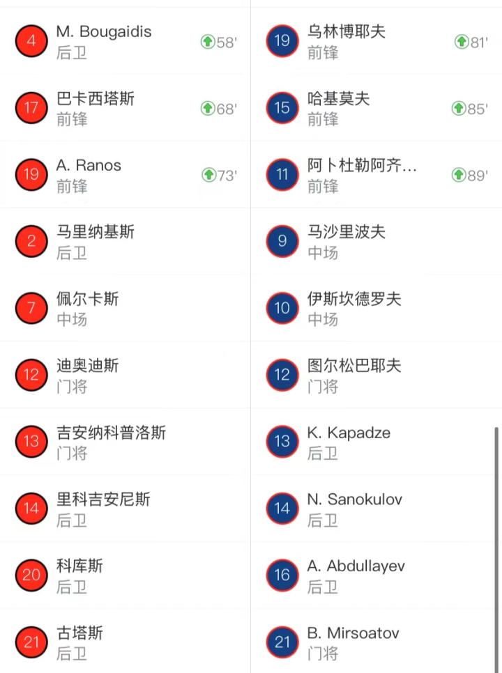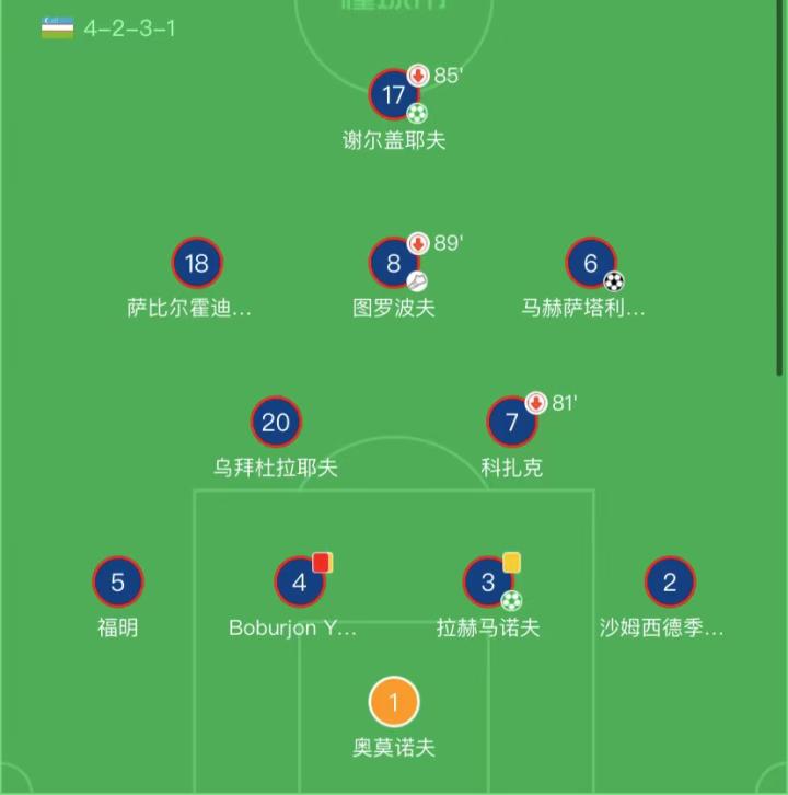 乌兹别克斯坦:1尤拉耶夫;2-菲里波斯扬(第80分钟,4-卡里莫夫)、3-穆拉赞诺夫(第65分钟,7-哈伊达罗夫)、20-图塔胡贾耶夫、6-尤拉耶夫;8-杰帕罗夫、13-图拉耶夫、18-卡帕泽、28-安德雷夫(第51分钟,10-拉加波夫);14-萨德林、15-海因里希