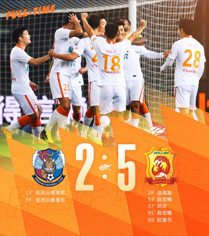 12月15日19:30,2021赛季中超联赛第16轮,武汉队凭借赵宏略“双响炮”,洛佩斯、刘云和拉斐尔的进球5-2逆转青岛队,迎来“保级战”两连胜,致敬卓尔足球十周年。
