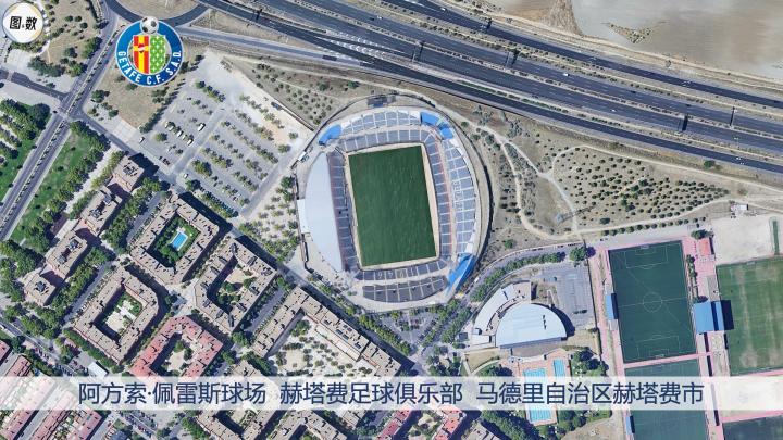 赫塔费的主场是阿方索·佩雷斯球场,球场紧挨着西班牙M45高速公路,这是一条区域性高速公路,全长37公里,主要沟通马德里都会区南部和东部的城市。赫塔费差一点点就是一支首都球队了,因为M45高速公路在佩雷斯球场北面的这段区间也是马德里市比利亚韦德区和赫塔费市的分界线,公路以北属于马德里市,公路以南属于赫塔费市。