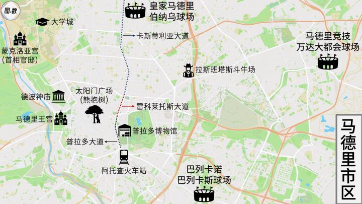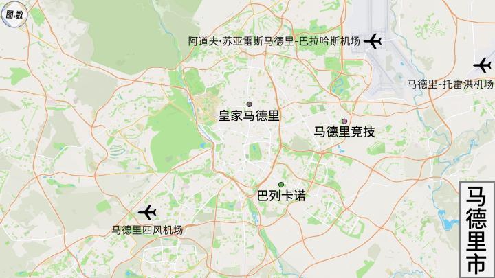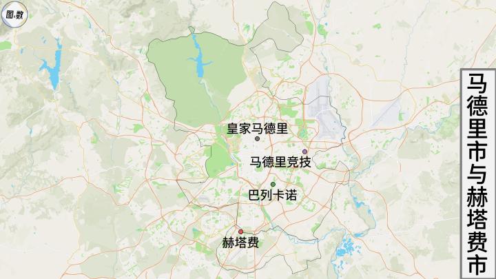 马德里市有3家西甲俱乐部,其中皇马离市中心最近,其次是城南的巴列卡诺,而城东的马竞位置比较偏远一些。