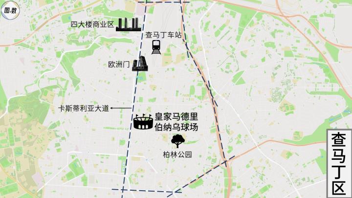 皇家马德里的伯纳乌球场位于查马丁区,这是马德里地价比较昂贵的一个区,有点儿类似切尔西所在的伦敦哈默史密斯-富勒姆区。查马丁区交通比较便利,查马丁车站是马德里第二大火车站,在这里可以乘坐火车前往西班牙北部的希洪、毕尔巴鄂和巴拉多利德等足球城市。