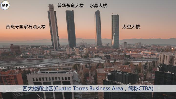 顾名思义,四大楼商业区就是四栋摩天大楼,西班牙人给商业区取名字是真得很淳朴,这四栋楼也是西班牙最高的四座建筑,其中高249米的水晶大楼不仅是西班牙第一高楼,也是欧盟第四高楼,仅次于波兰的华沙塔、德国法兰克福的商业银行大厦和会展之塔。不过,随着普华永道大楼西侧的卡莱多大楼即将竣工,四大楼商业区可能要变成五大楼商业区,成为马德里的地标性建筑。