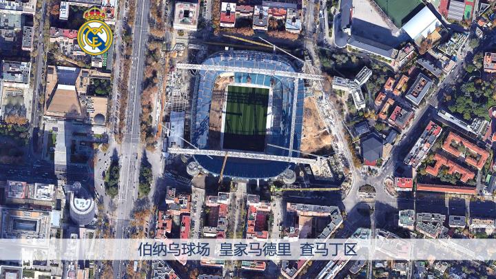 马德里的另一座地标——伯纳乌球场,位于查马丁区中部偏西的位置,目前正在进行改建,将建设一座覆盖赛场和看台上空的可开合式顶棚,从而减少恶劣天气对比赛的影响,此外球场将会重塑外立面,使其线条更为流畅。