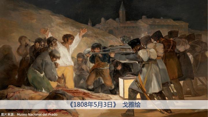 戈雅为此创作了两幅作品,《1808年5月2日》和《1808年5月3日》,我认为后者更有启发意义,在画家的笔下,即将被处决的起义军战士并不是像救世主那样崇高、伟大,而是看起来很迷茫、很无助,因为他们就是普通的马德里人,是公园的花匠、是布庄的裁缝、是郊区的农民、是街头的小贩,这让我想到一句话“世上从来没有从天而降的英雄,只有挺身而出的凡人”。