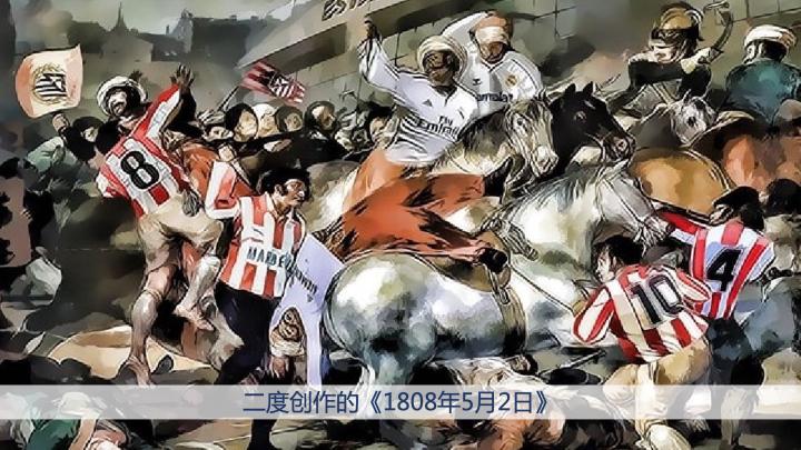 不过,有趣的是,在西班牙社交媒体上,有球迷对《1808年5月2日》进行了二次创作,让法军都穿上了皇马的白色球衣,而让马德里市民穿上马竞的红白条纹球衣,因为皇马象征着王权,而马竞象征着平民,这两支首都球队之间的竞争还是比较激烈的。