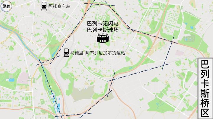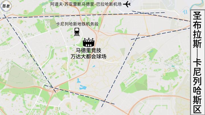马德里竞技位于城东的圣布拉斯-卡尼列哈斯区,这里离马德里城市核心区还有一定距离,中间隔着一个休达利内亚尔区。