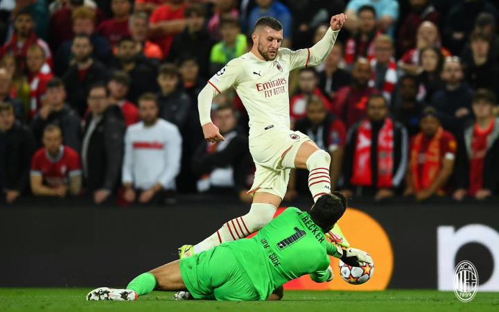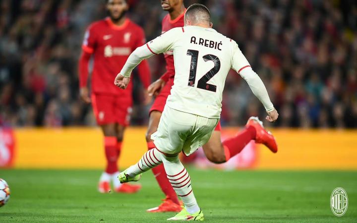 新赛季开始,前两场替补的雷比奇在第三场迎战蓝鹰时用两记精彩的助攻为客场挑战利物浦牛刀小试。2021.9.16,安菲尔德球场,AC米兰重新踏上欧冠赛场。作为四档球队被分在死亡小组的米兰面对近些年欧陆赛场上叱咤风云的红军并没有太大把握,球迷们也期待球队可以打出水平自己的风格,输赢并不是最大的问题。从比赛的第一分钟开始,利物浦就用他们强大的压迫将米兰压的喘不过气,第八分钟,阿诺德突入禁区,造成托莫里乌龙,早早取得领先优势。然而被动的米兰并没有对方的威压下缴械投降,他们等待着一个机会,一个告诉世界“米兰回来了”的机会。第41分钟,上半场行将结束,红军的压迫有所放松,红黑军团抓住机会发起反击。被压迫在己方半场鲜有拿球机会的雷比奇游弋在马蒂普和乔戈麦斯身后,在红军的防线深处细嗅机会的味道。终于,迪亚斯、萨勒马克尔斯和莱奥简洁细腻的配合让利物浦的防线出现了一丝破绽,潜伏许久的雷比奇跑出空档,莱奥的斜塞随之而来,调整好步伐迎球搓射……沉默,然后是短暂的沉默,人声鼎沸的安菲尔德瞬间沉默,只有客队看台上的米兰球迷们瞬间沸腾了。雷神显威!7年的等待如雷比奇搓出的贴地美妙弧线,最终进入球门。
